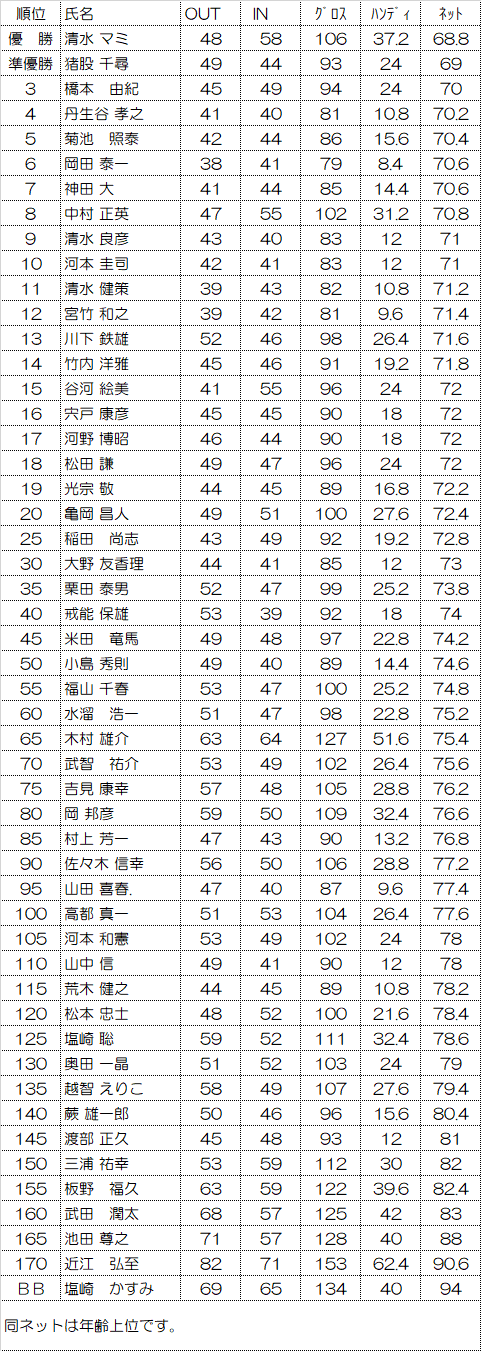 順位 | 氏名 | OUT | IN | グロス | ハンディ | ネット |
