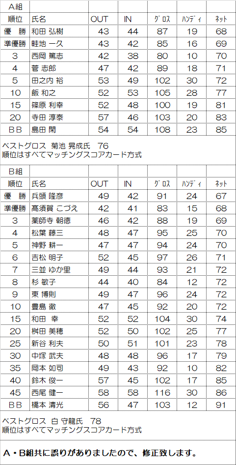 | ベストグロス 白 守龍氏 76 順位はすべてマッチングスコアカード方式 |