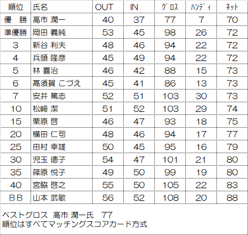 | ベストグロス 白 守龍氏 77 順位はすべてマッチングスコアカード方式 |