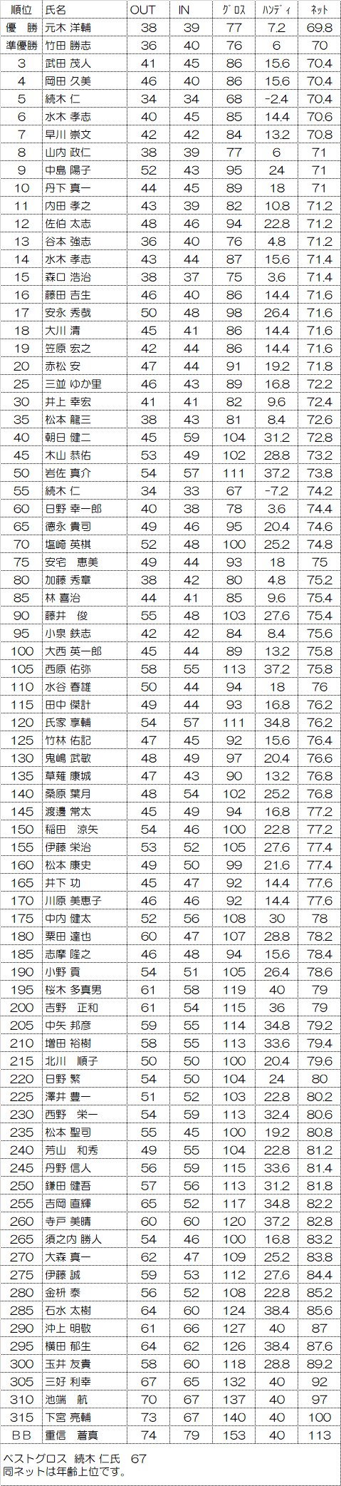 | 順位 | 氏名 | OUT | IN | グロス | ハンディ | ネット |